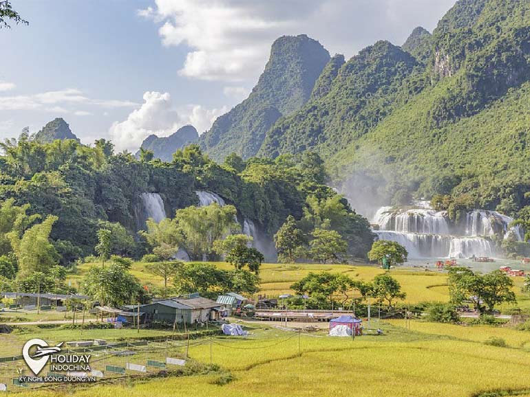 Mùa khô thác Bản Giốc Cao Bằng bắt đầu từ những ngày tháng 10 và kéo dài đến tận tháng 5 năm sau. Khung cảnh Bản Giốc vốn dĩ thanh bình nay còn yên bình và tĩnh lặng. Bức tranh thiên nhiên ngập tràn sắc xanh trong mát mẻ nay đã hòa cùng màu vàng ươm của lúa chín, tạo nên một khung cảnh chẳng thể lãng mạn hơn. Vào mùa khô, dòng nước chảy không xiết và mạnh như tầm tháng 6, thay vào đó là một vẻ trầm mặc, an nhiên hơn. Phia xa xa, những ruộng lúa chín, ngả nghiêng theo từng làn gió mát rượi. Tất cả đã góp phần tạo nên bức tranh thiên nhiên muôn màu, sống động nhưng cũng vô cùng yên bình nơi đây. Đây cũng là lý do mà mỗi cuối tuần, Cao Bằng lại đón những vị khách đi tour Thác Bản Giốc từ Hà Nội đến nghỉ ngơi, “xả stress” sau một tuần làm việc mệt mỏi.